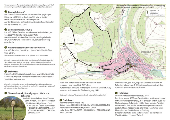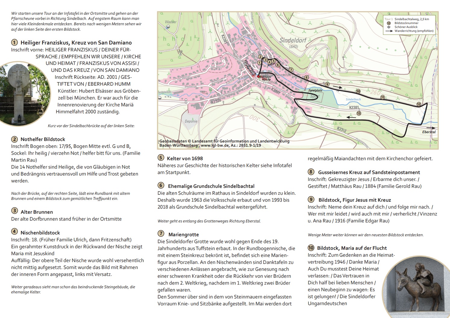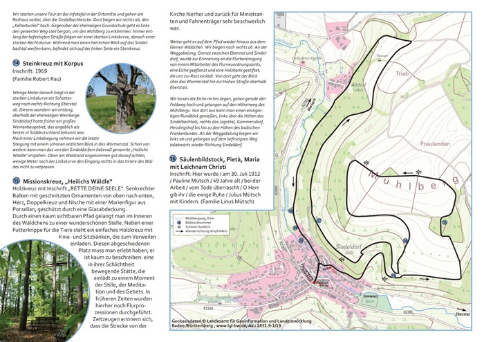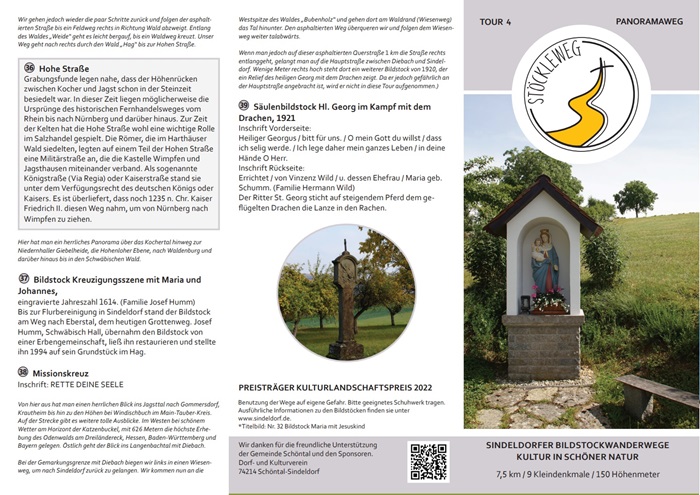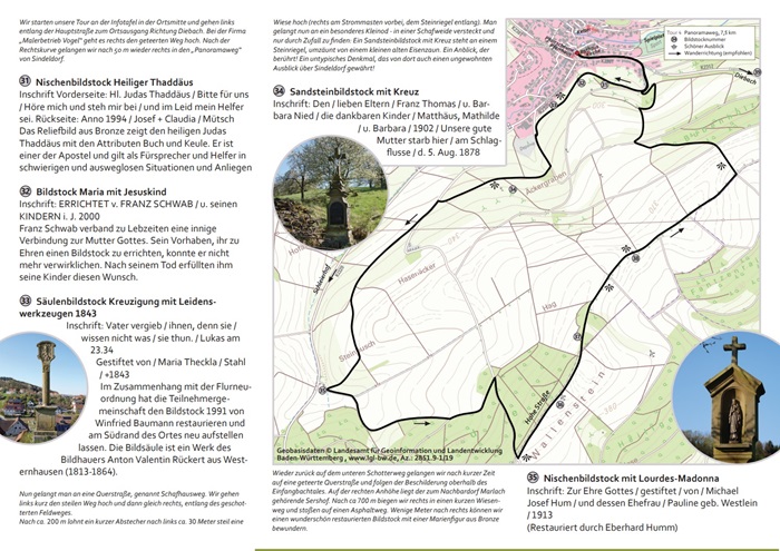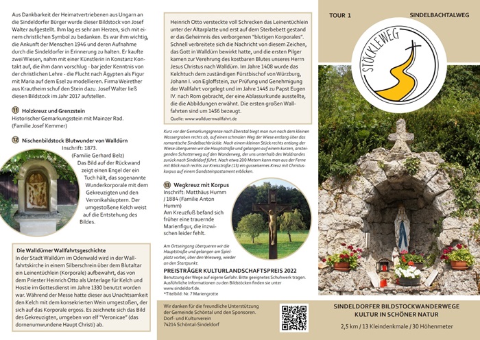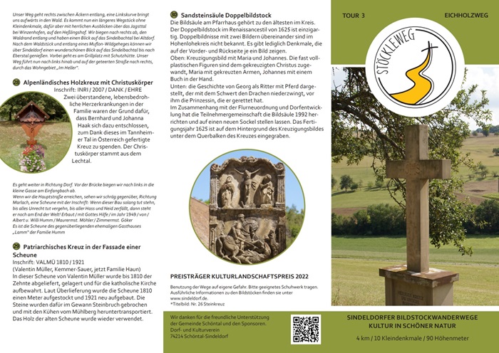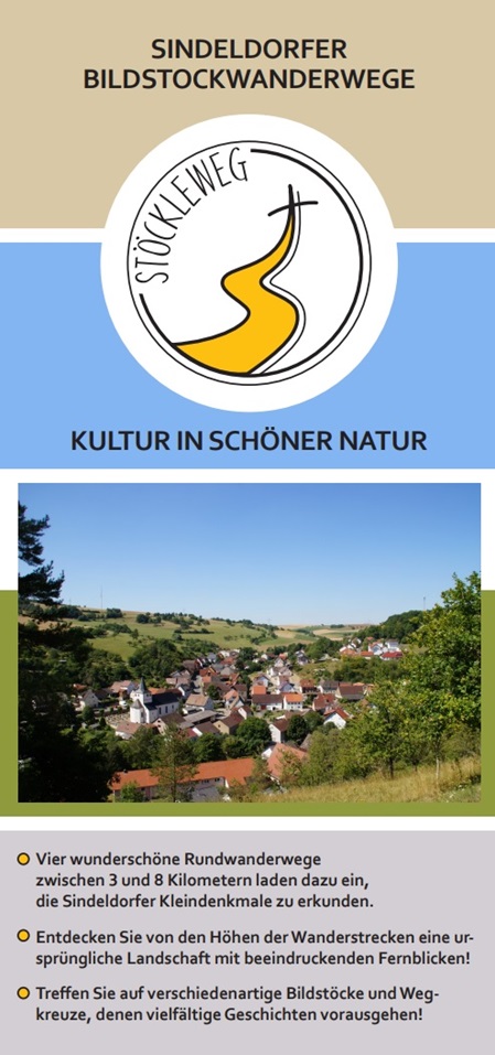 Mit vielen Ehrenamtlichen wurden aus diesen Informationen 4 Rundwanderwege entlang der Bildstöcke konzipiert. Im Sindeldorfer Ortsmittelpunkt, vor der Kirche „Mariä Himmelfahrt“, dem Pfarrhaus mit der zum Gemeindehaus umgebauten ehemaligen „Pfarrscheune“ und dem alten Rathaus von 1841 wurde eine Informationstafel mit Flyern aufgestellt. Ein optimaler Platz, um die Touren in die umliegenden Höhen zu starten.