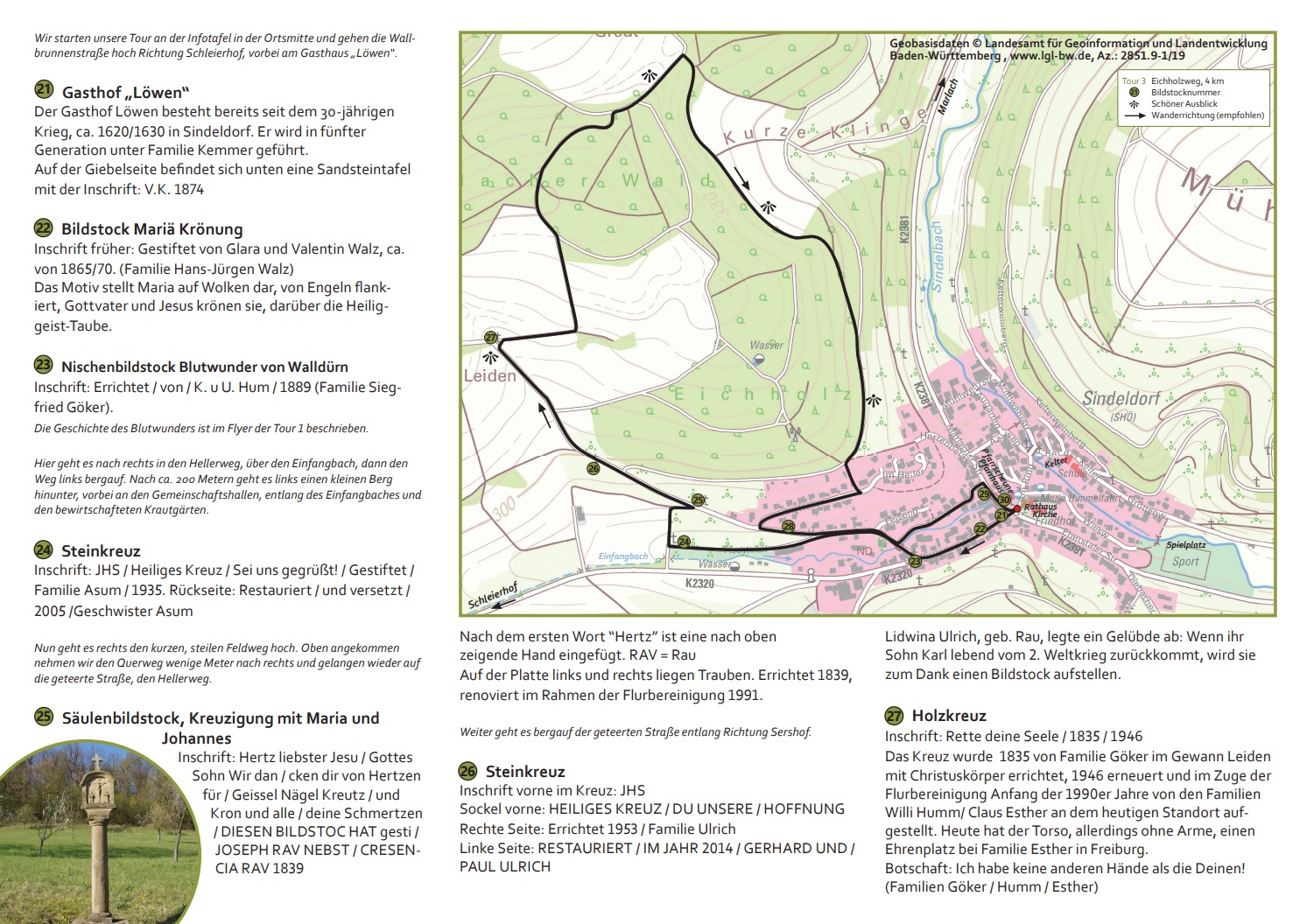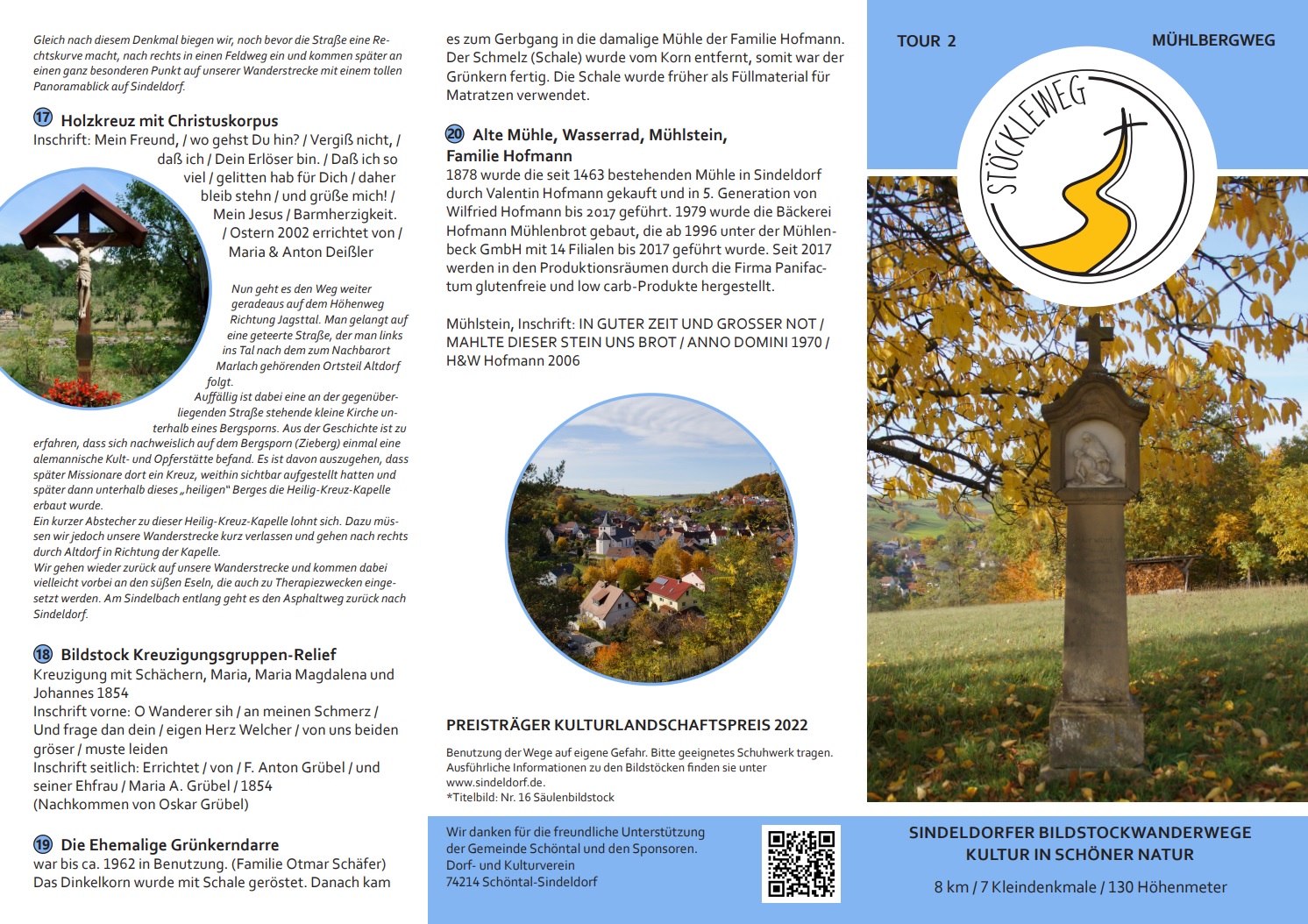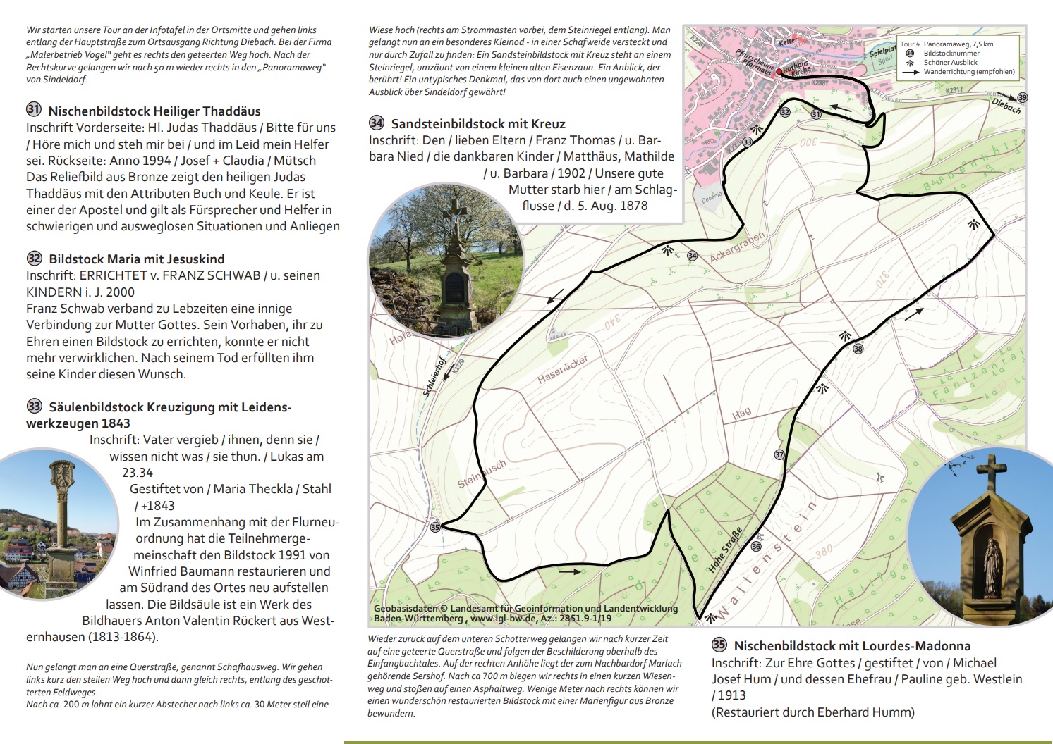 Mit vielen Ehrenamtlichen wurden aus diesen Informationen 4 Rundwanderwege entlang der Bildstöcke konzipiert. Im Sindeldorfer Ortsmittelpunkt, vor der Kirche „Mariä Himmelfahrt“, dem Pfarrhaus mit der zum Gemeindehaus umgebauten ehemaligen „Pfarrscheune“ und dem alten Rathaus von 1841 wurde eine Informationstafel mit Flyern aufgestellt. Ein optimaler Platz, um die Touren in die umliegenden Höhen zu starten.