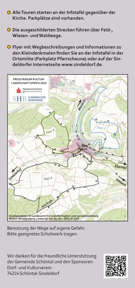Die Flyer zu den vier Wanderwegen liegen an der Infotafel vor der Kirche in Sindeldorf aus. Zudem können Sie Touren hier online anschauen und als PDF-Datei downloaden: